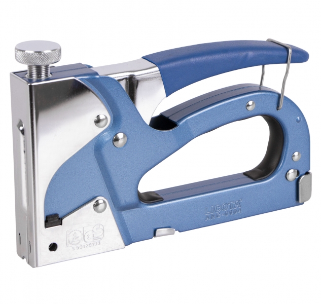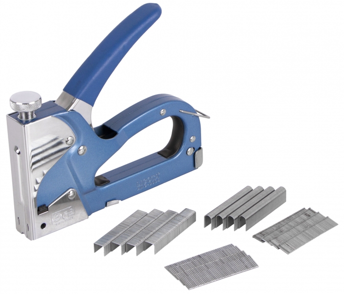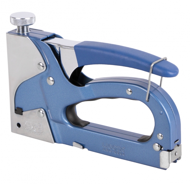 Komfortní čalounická sešívačka pro denní užití. Díky ergonomické rukojeti perfektně sedne do ruky. K dostání v příjemném, matně modrém odstínu (viz. ilustrační foto).